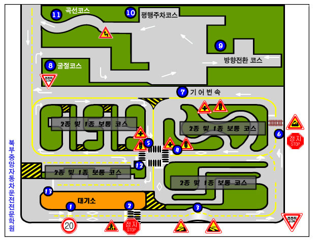 - 출발코스, 굴절코스, 곡선코스, 방향전환코스, 평행주차코스, 기어변속코스, 교통신호가 있는 십자형 교차로코스, 횡단보도코스, 철길건널목코스, 경사로코스, 종료코스